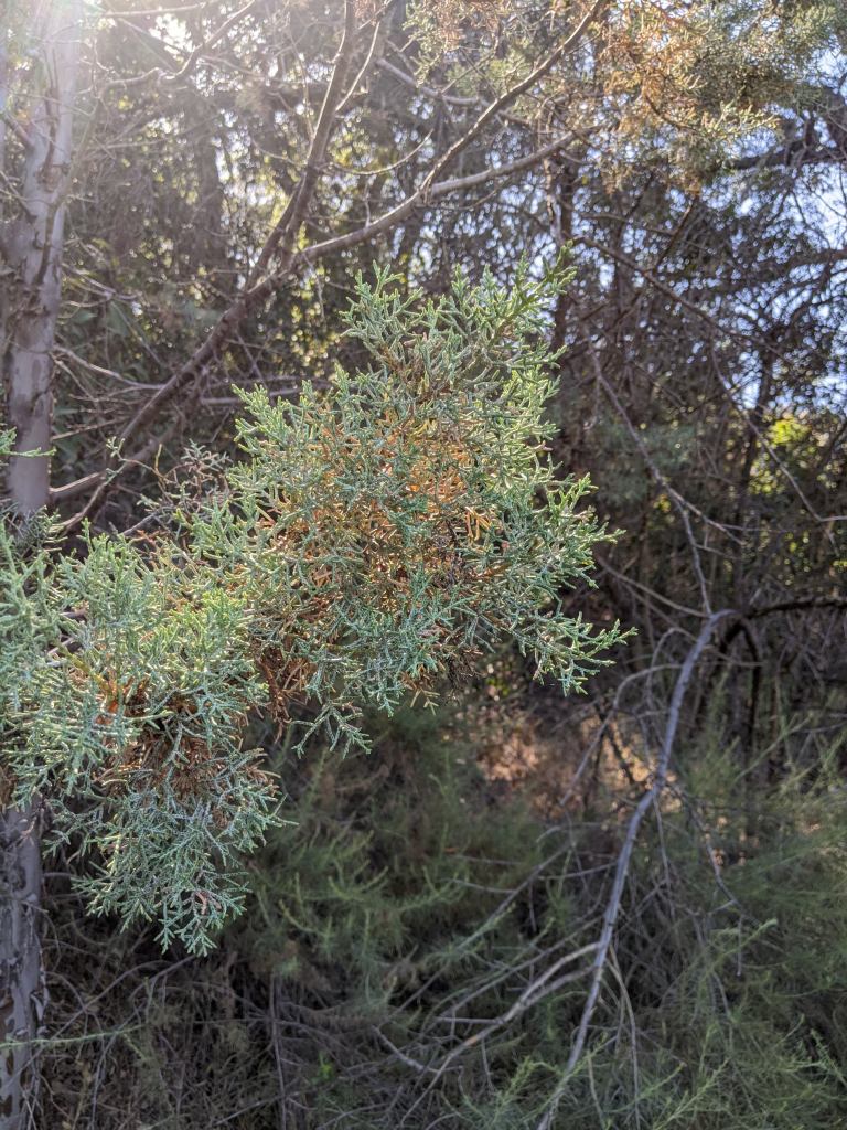 When you are only going to be in an area for a short time, and you start weeks before trying to contact park rangers on the forms on their websites but get no reply, you have to hope that when you get there you will have better luck. My process involves finding out which trees are endangered in a state and geographical region, then trying to narrow it down to where I might be able to find those trees. There are several sites that mention the Cuyamaca Cypress, including the Calscape site which let me know there were only 30-40 mature trees after the 2003 Cedar Fire, but a lot of the sightings of this tree were 80 to 90 years ago. One of the sites that I found actually had GPS coordinates for a single tree, (conifers.org) but I was hoping to find stands of them in order to select the most photogenic for my painting and Ghost Forest.