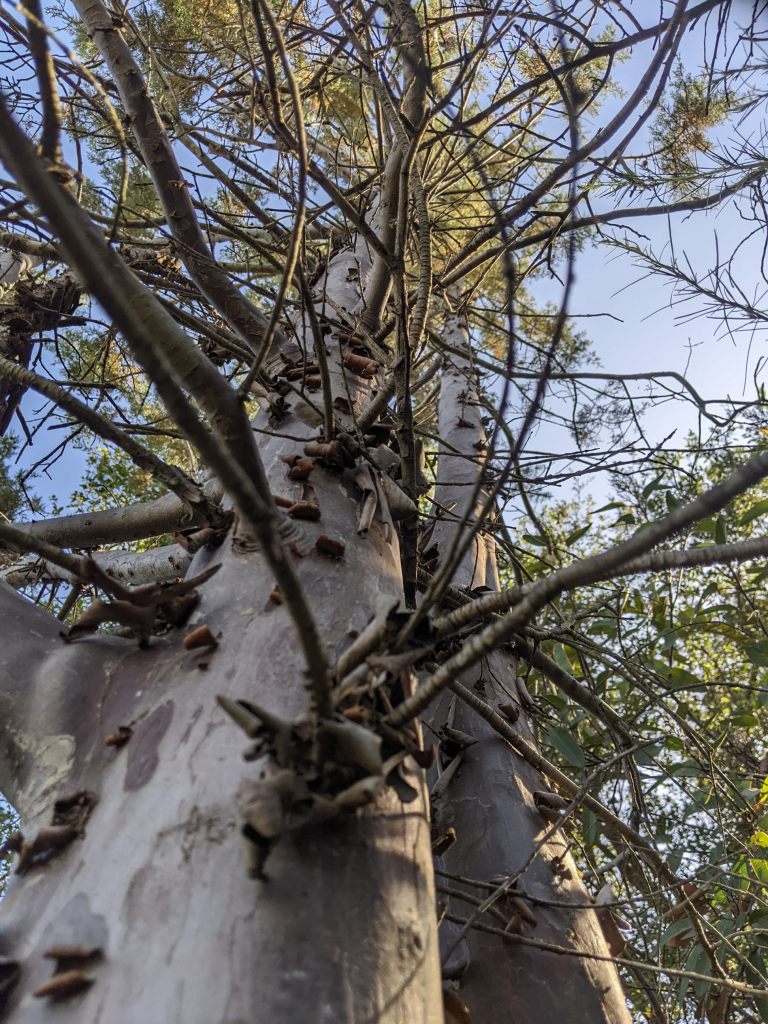 We retraced our steps and went around the back of the fire station, hoping to find a small trail. After a few wrong turns we did locate a “path”, and with a little bit of exploration involving forging through lots of prickly plants, we found the tree! The light was golden with a slight haze as evening set in. As I photographed the tree with limited success (light was obscured by surrounding foliage), my family explored the area. Just a short way above the tree, my husband found a gorgeous little glade with California live oaks.