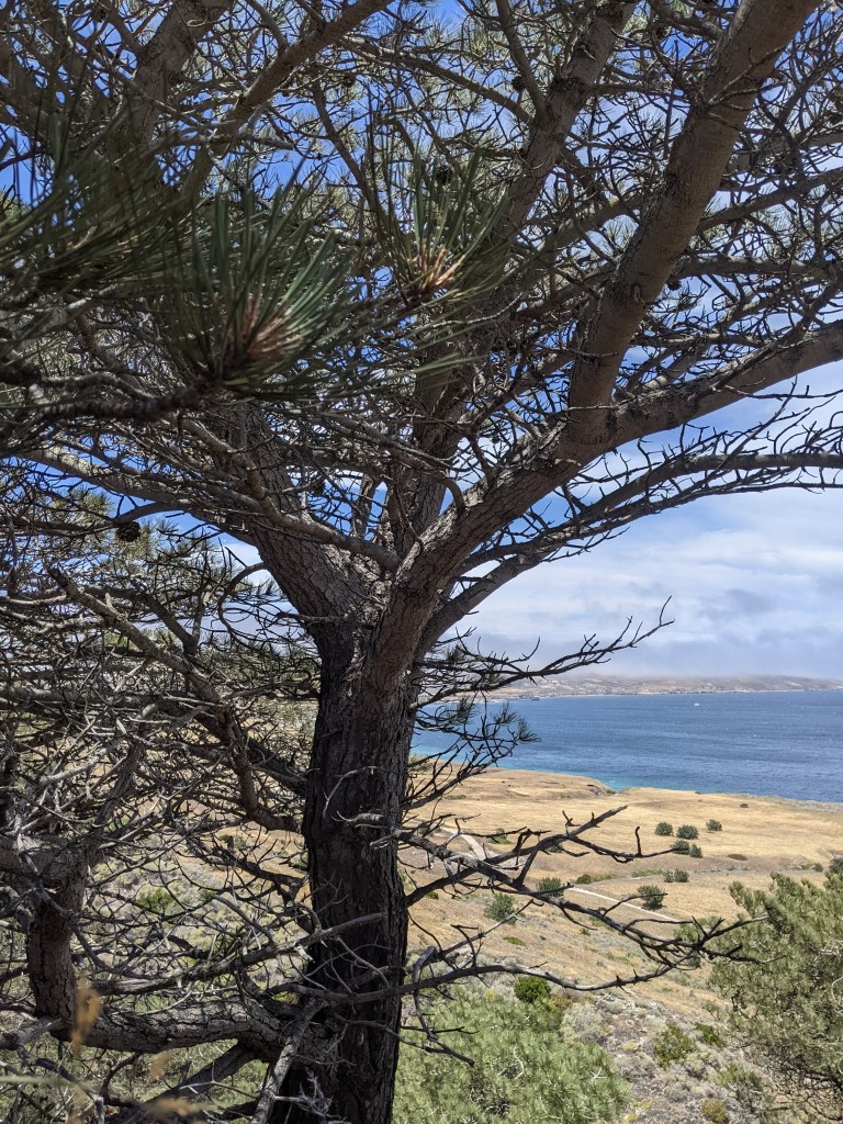 A subspecies of the Torrey Pine, specific only to Santa Rosa Island, required a long boat ride to access. The ride was a bit rough and we had to quell nausea with a steady eye on the horizon plus a patch behind our ears, and wrist bands . We were so fortunate to see a large pod of dolphins with assorted seabirds attending. With a stop to let people off at Santa Cruz, the purported 2.5 hour boat ride became 3.5 hours, and the time allotted on the island shrank accordingly. When we arrived, I asked ranger Dylan if it would be possible to make the Torrey Pines 7.5 mile loop in the given time. He said if you walk with intent and an eye on the clock, you will reach the base of the grove in 2.5 miles.